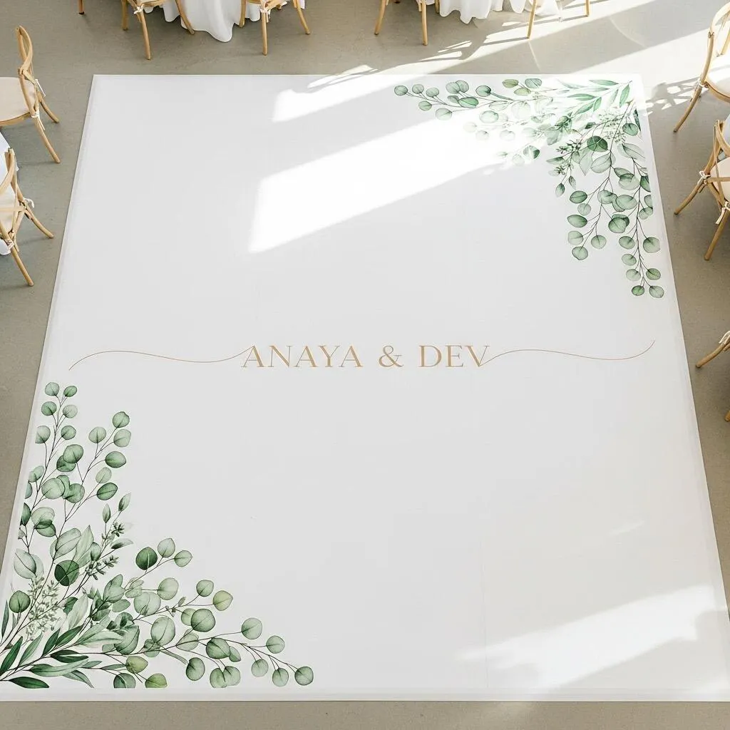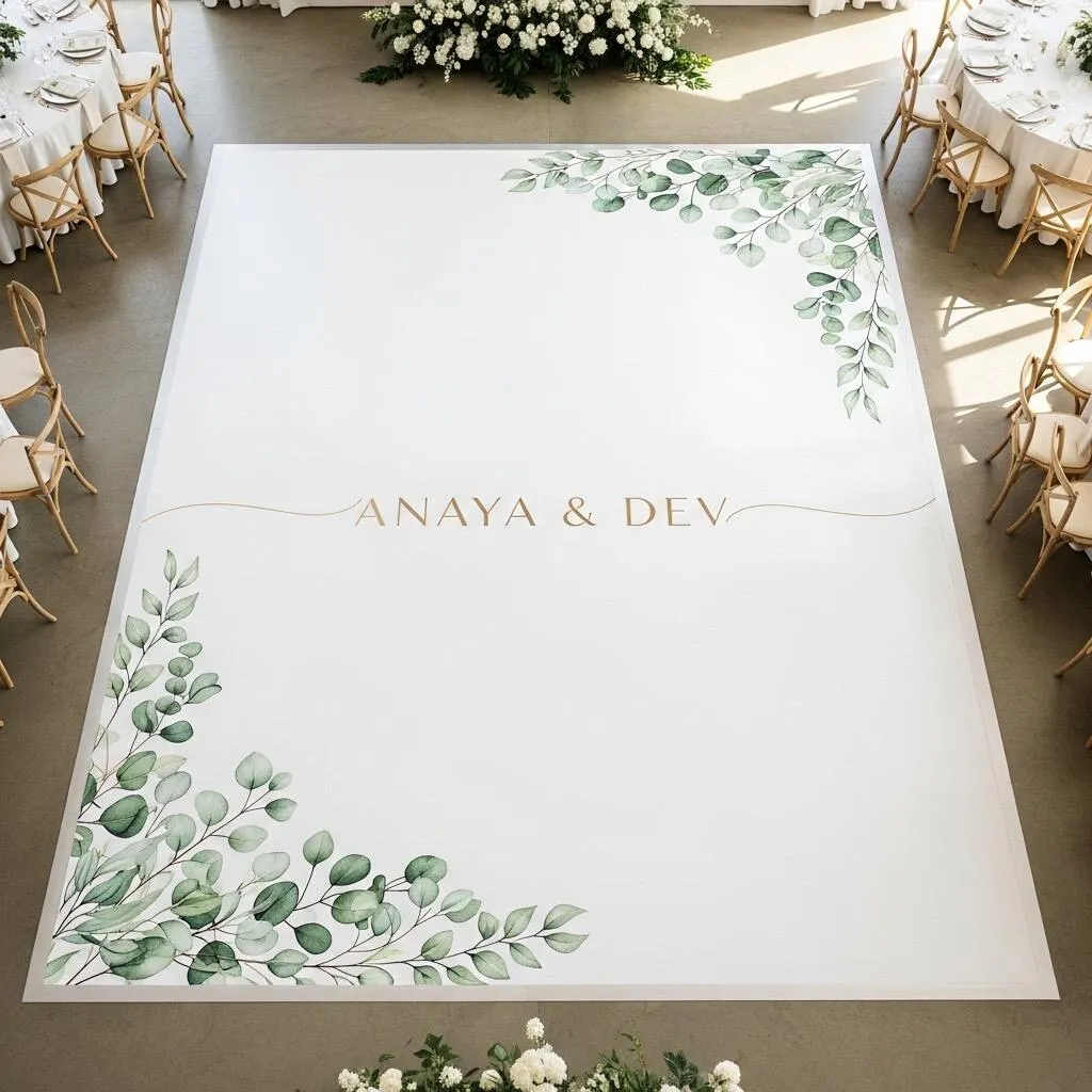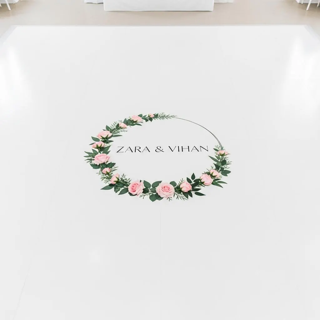 Most weddings have a centerpiece on every table. Yours will have one on the floor too β fully custom, designed around your names, monogram, or vision, and printed on professional-grade UV-cured vinyl that holds its color through every dance, every flash photo, every spilled drink.